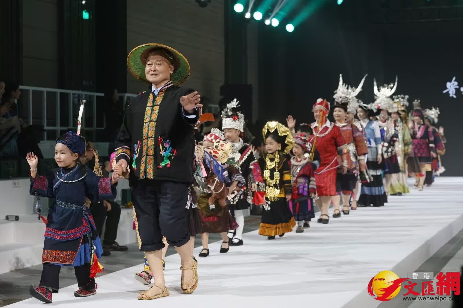 壓軸登場的是兩位白髮蒼蒼的長者。她們身着色彩濃烈、刺繡繁複的民族華服,衣身上的龍紋花鳥、圖騰紋樣層層疊疊,是耗時數年一針一線繡就的心血。從孩童到長者,這場秀打破了年齡的界限,讓非遺服飾不再是博物館裏的靜態展品,而是穿在身上、活在當下的文化載體。