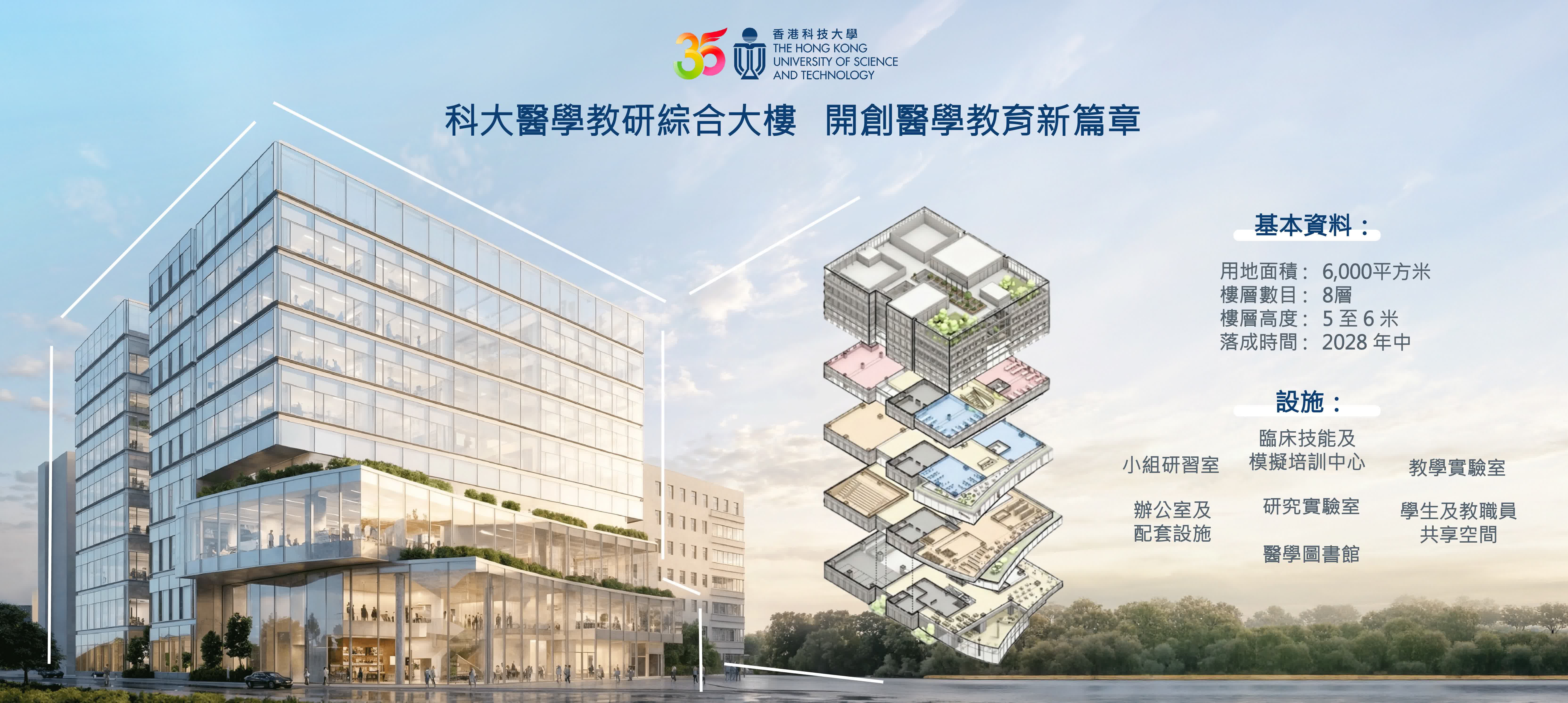 特區政府去年底宣布由科大籌辦本港第三所醫學院,雙方積極推進有關工作,醫學院發展將圍繞生物科學、人工智能及機械人等方向,以及人口老化等嚴峻挑戰。醫學教研大樓屬科大醫學院核心設施之一,樓高8層配有多樣化設施,校方正招聘創院院長,並持續招攬不同領域的教授,並已定出其第二學位醫科課程框架,目標於明年中啟動招生。