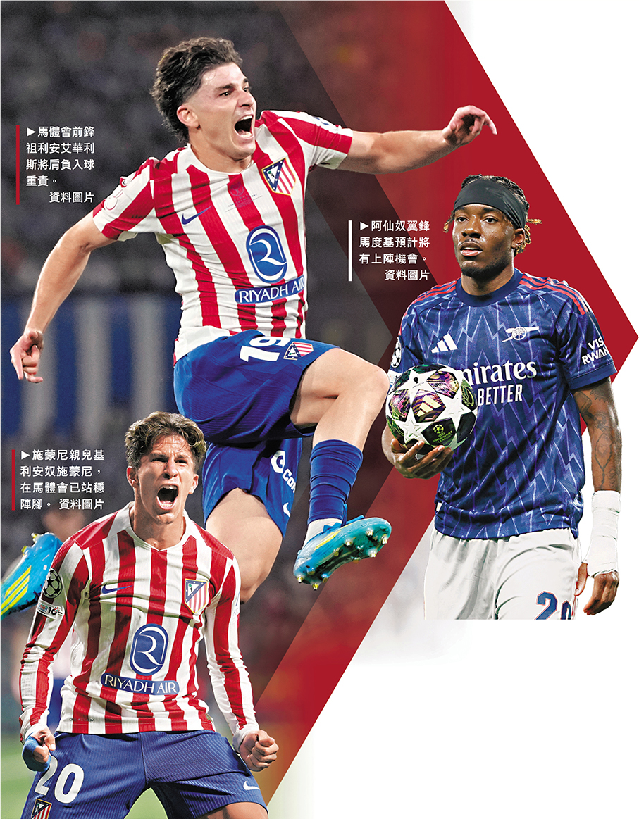歐聯於香港時間周四(30日)凌晨上演另一場四強首回合賽事,馬德里體育會將先於主場迎戰「兵工廠」阿仙奴。馬體會在西甲雖時常屈居於巴塞隆拿和皇家馬德里之下,但球隊在主帥施蒙尼帶領下,在盃賽往往有更佳發揮,是役配合主場之利面對攻力疲弱的阿仙奴,絕對有力先下一城。(Now643台周四3:00a.m.直播) ●香港文匯報記者 楊浩然