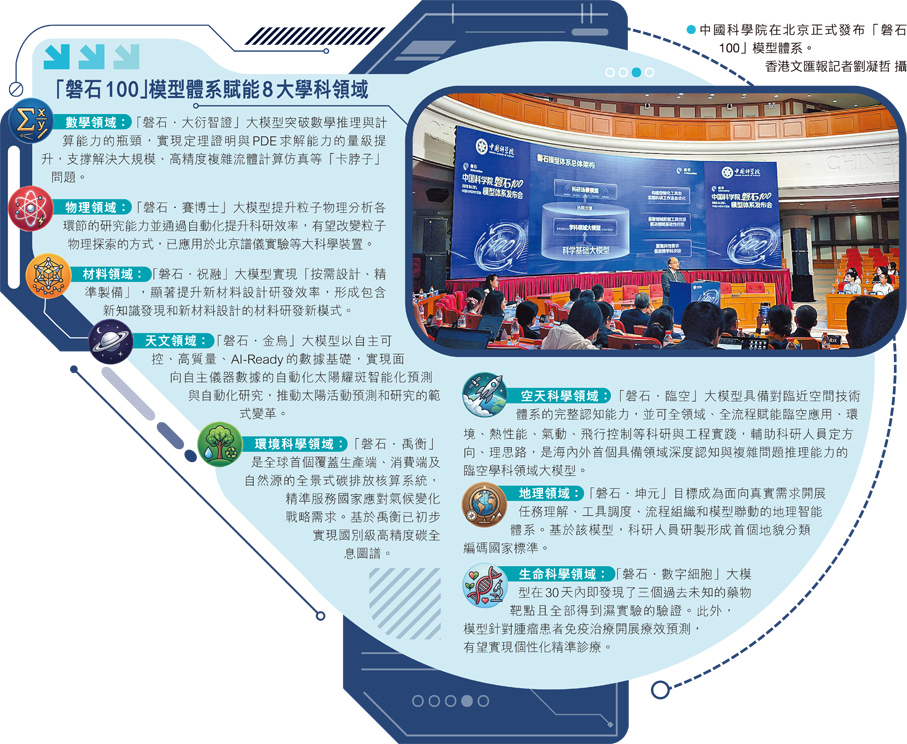 中國科學院「磐石100」模型體系28日正式發布,該模型體系支持八個學科領域大模型應用(見表)。其中「磐石·臨空」大模型由中國科學院空天信息創新研究院、自動化研究所聯合研製,是國內首個面向臨近空間(距地面20至100公里)領域知識重構與智能突破的學科知識大模型,成為控制高空氣球、太陽能無人機、高超音速飛行器等的系統平台。標誌着中國在臨近空間數智科研與工程應用領域取得重要技術突破,在臨近空間領域「人工智能+科學」「人工智能+工程」融合發展方面邁出重要一步。●香港文匯報記者 劉凝哲 北京報道