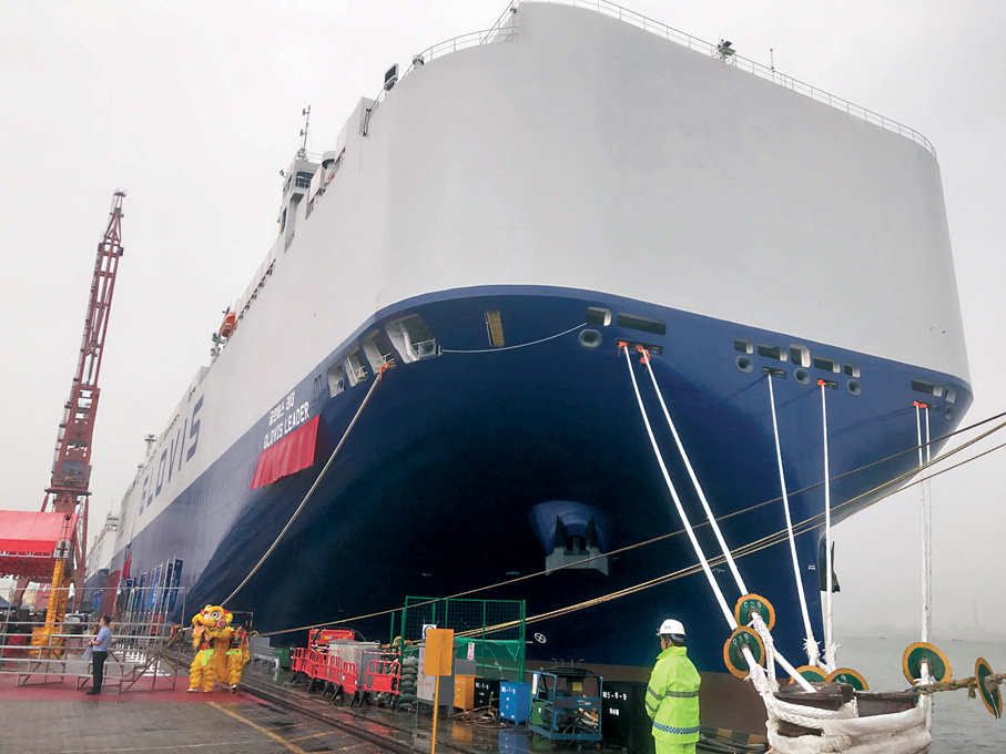 香港文匯報訊(記者 方俊明 廣州報道)「灣區造」全球首艘萬車級汽車運輸船「格羅唯視 領航」輪28日在廣州命名交付。建造方中船廣船國際表示,該船單船最大裝車量達10,800輛,刷新全球同類船舶運力紀錄。同時,整船配置全液壓驅動系統,多項裝備規模、建造工藝均為行業首創;並搭載了國產軸帶發電機,實現「邊航行邊發電」,滿足航行電力需求;全套超大規格滾裝設備也實現了國產化。這標誌着中國高端船舶製造能力實現新突破,為全球航運業綠色低碳轉型提供了「中國方案」。