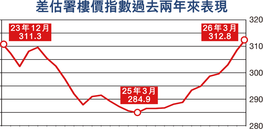 香港文匯報訊(記者 陳鍵行)受惠出口、金融及旅遊業持續增長,本港GDP截至去年第四季,已經連續12個季度上升,經濟回暖亦帶動樓市持續上升。差餉物業估價署昨日公布,今年3月私人住宅售價指數報312.8點,按月升1.39%,為連續第10個月上升,指數創逾兩年新高。市場分析認為,首季樓市表現反映整體入市氣氛熱烈,相信樓市已企穩,在中東局勢未有太大影響的情況下,全年樓價有望錄得8%至10%升幅。