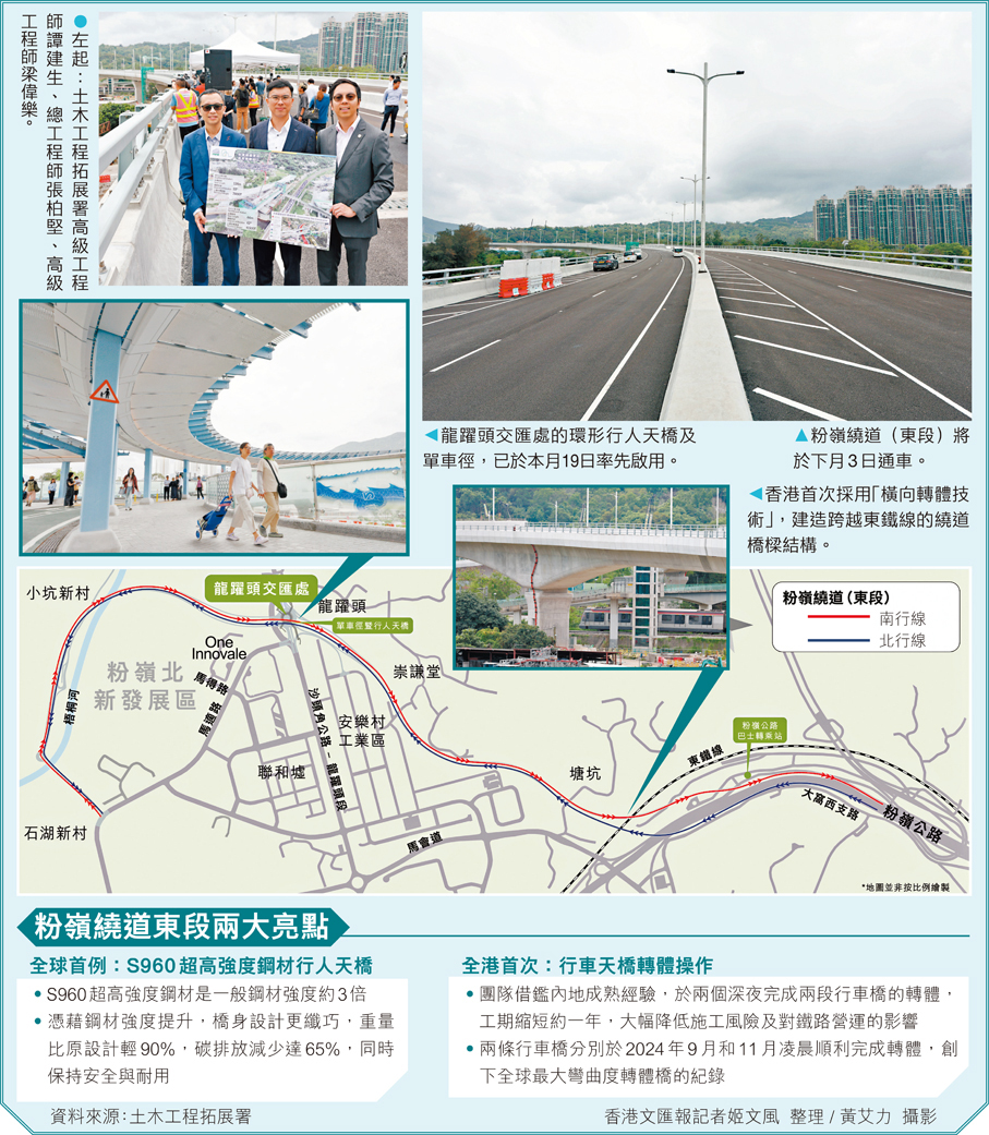 香港文匯報訊(記者 吳健怡)由土木工程拓展署興建的粉嶺繞道(東段),連接粉嶺公路到粉嶺北新發展區,全長約4公里,將於下月3日早上8時通車,成為北部都會區首個落成的大型運輸基建。土拓署昨日介紹,工程引入多項創新技術,更創下兩個全球第一,包括全球第一大彎曲度的轉體橋及全球第一例採用S960國產超高強度鋼材的行人天橋,通車後上水及粉嶺居民使用繞道進出九龍,可避開區內繁忙道路,節省約10分鐘車程,有效分流交通,紓緩區內擠塞。