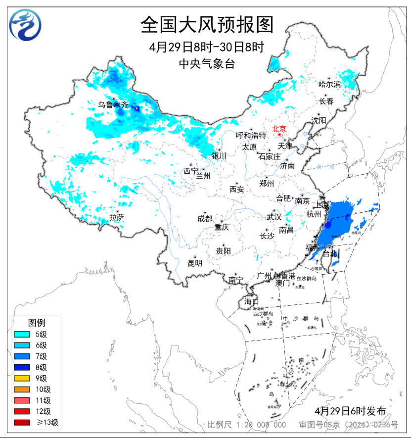 預計,4月29日8時至30日8時,新疆北部和東部、內蒙古西部和中部偏北地區、甘肅西部、黑龍江東部、西藏西部等地部分地區有5~6級風,陣風7~8級,其中,新疆北部和東部等地部分地區風力可達7~8級,陣風9~10級。東海西部海域、浙江南部沿岸海域、福建沿岸海域、台灣海峽將有7~8級、陣風9~10級的大風。