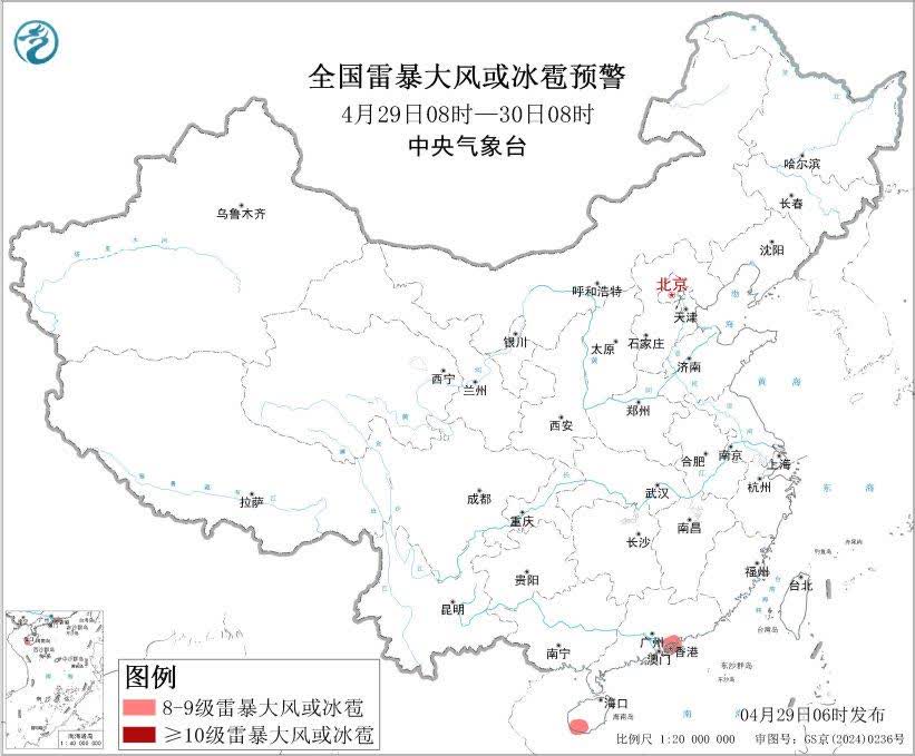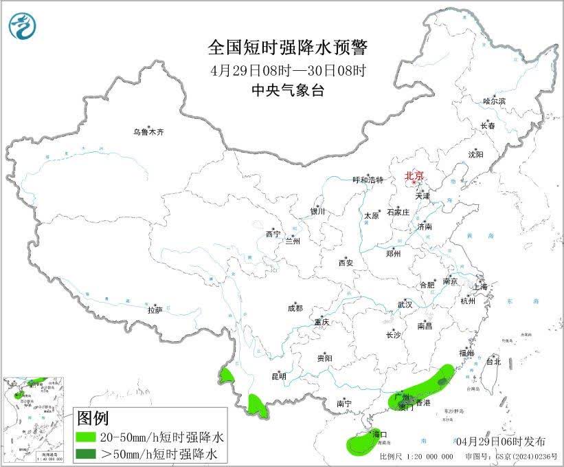 預計4月29日8時至30日8時,廣東中南部、海南島西南部等地的局地將有8級以上雷暴大風或冰雹天氣;華南東南部、西南地區西南部等地的部分地區將有小時雨量大於20毫米的短時強降水天氣,其中,廣東中南部和西南部沿海等地的局地小時雨量大於50毫米,最大可達60毫米以上。