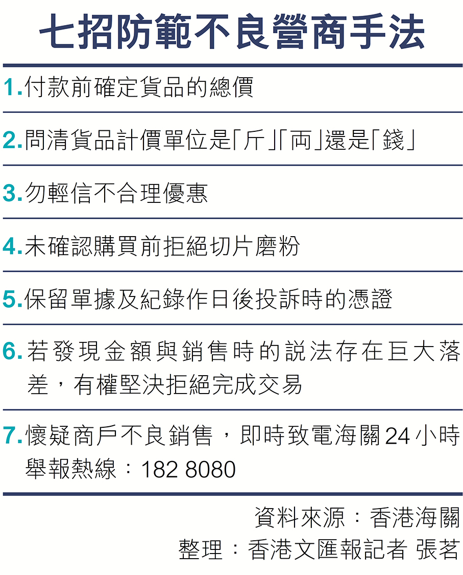 為幫助旅客避免墮入「斤、両、錢」陷阱,海關建議旅客購買中藥材、參茸海味等按重量計價的商品時,需先向店員確認計價單位並核實總價,確認無誤後才付款;切勿在未清楚價格前同意店員將商品磨粉或切片,避免因「商品已加工」而被強行要求付款。