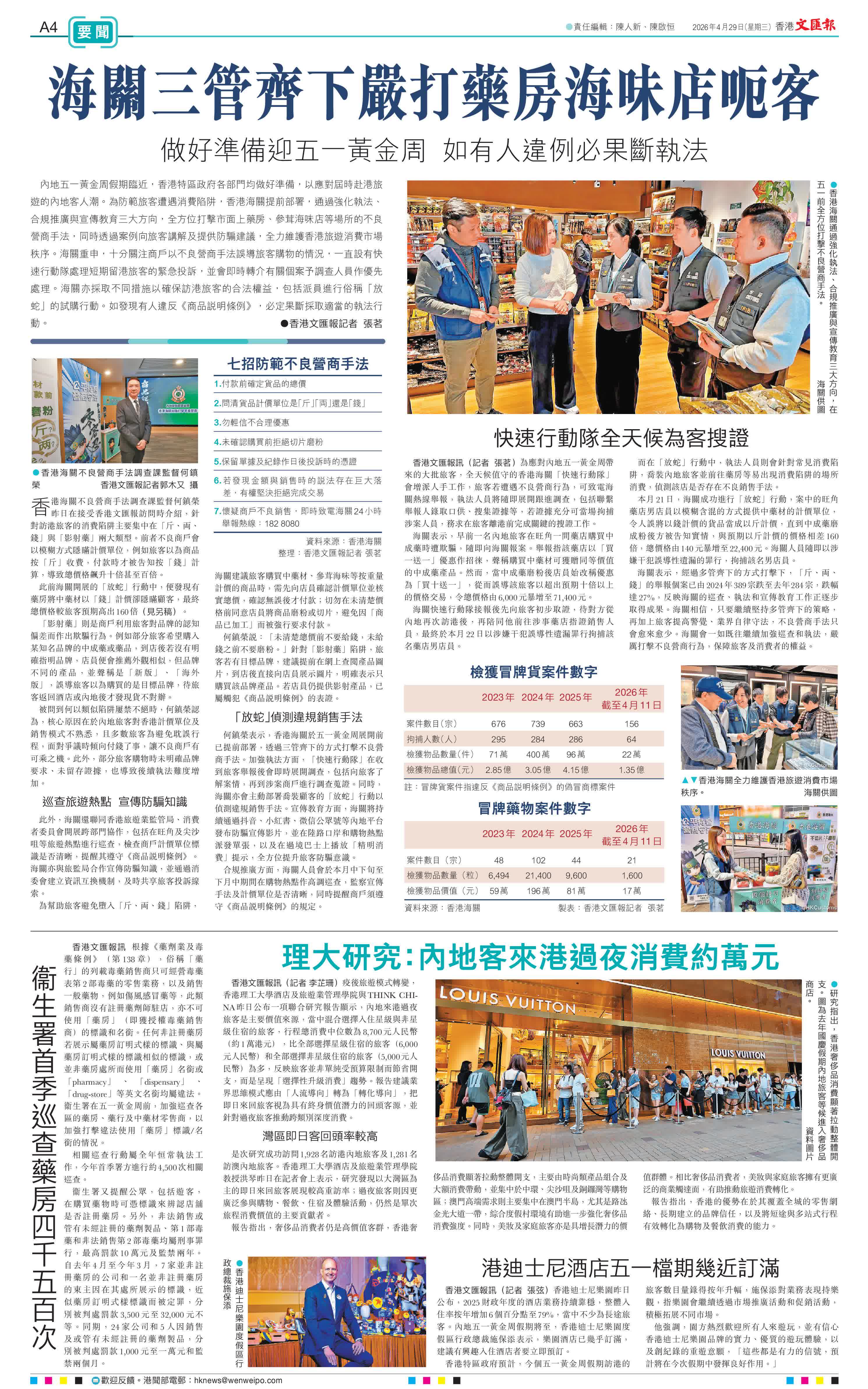(香港文匯報記者 張茗)內地五一黃金周假期臨近,香港特區政府各部門均做好準備,以應對屆時赴港旅遊的內地客人潮。為防範旅客遭遇消費陷阱,香港海關提前部署,通過強化執法、合規推廣與宣傳教育三大方向,全方位打擊市面上藥房、參茸海味店等場所的不良營商手法,同時透過案例向旅客講解及提供防騙建議,全力維護香港旅遊消費市場秩序。海關重申,十分關注商戶以不良營商手法誤導旅客購物的情況,一直設有快速行動隊處理短期留港旅客的緊急投訴,並會即時轉介有關個案予調查人員作優先處理。海關亦採取不同措施以確保訪港旅客的合法權益,包括派員進行俗稱「放蛇」的試購行動。如發現有人違反《商品說明條例》,必定果斷採取適當的執法行動。