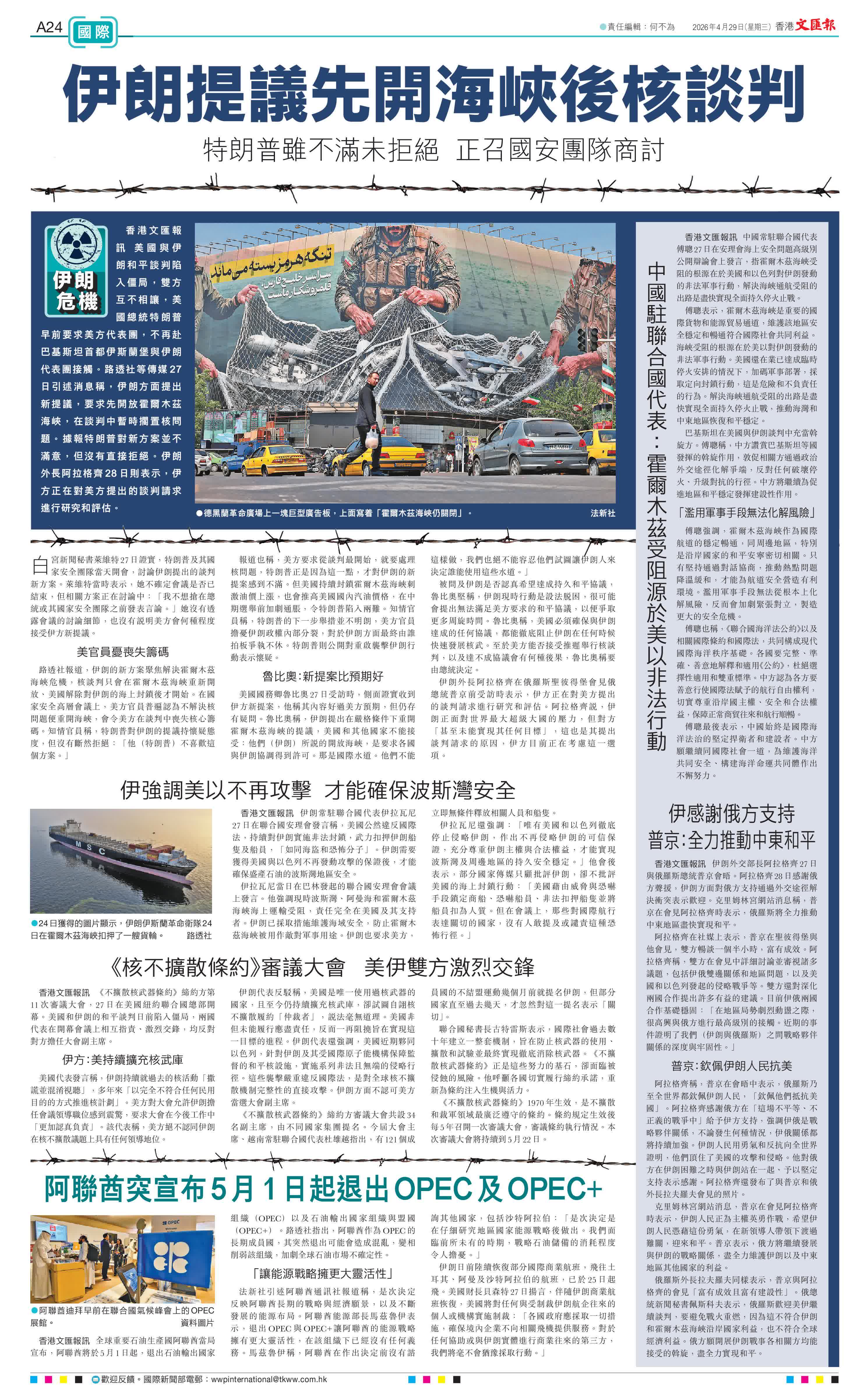 伊朗常駐聯合國代表伊拉瓦尼27日在聯合國安理會發言稱,美國公然違反國際法,持續對伊朗實施非法封鎖,武力扣押伊朗船隻及船員,「如同海盜和恐怖分子」。伊朗需要獲得美國與以色列不再發動攻擊的保證後,才能確保盛產石油的波斯灣地區安全。