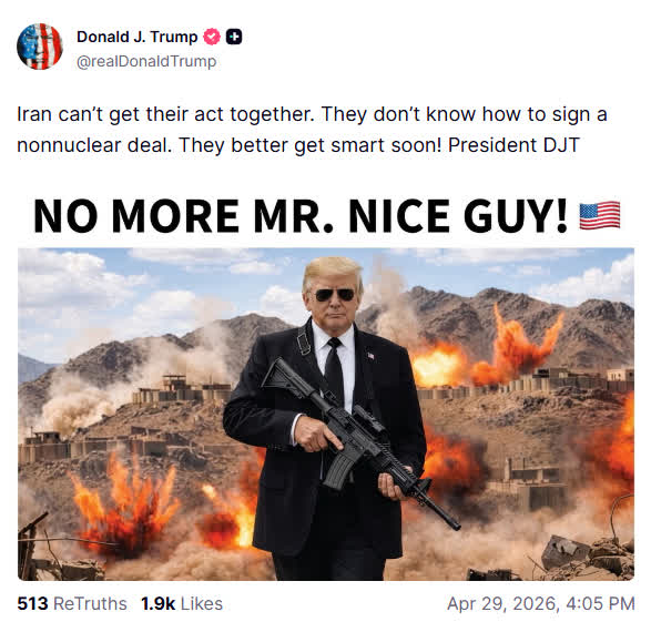 特朗普還配發一張圖片,圖片上是他持槍的「造型」,配有文字「不再有好好先生」。