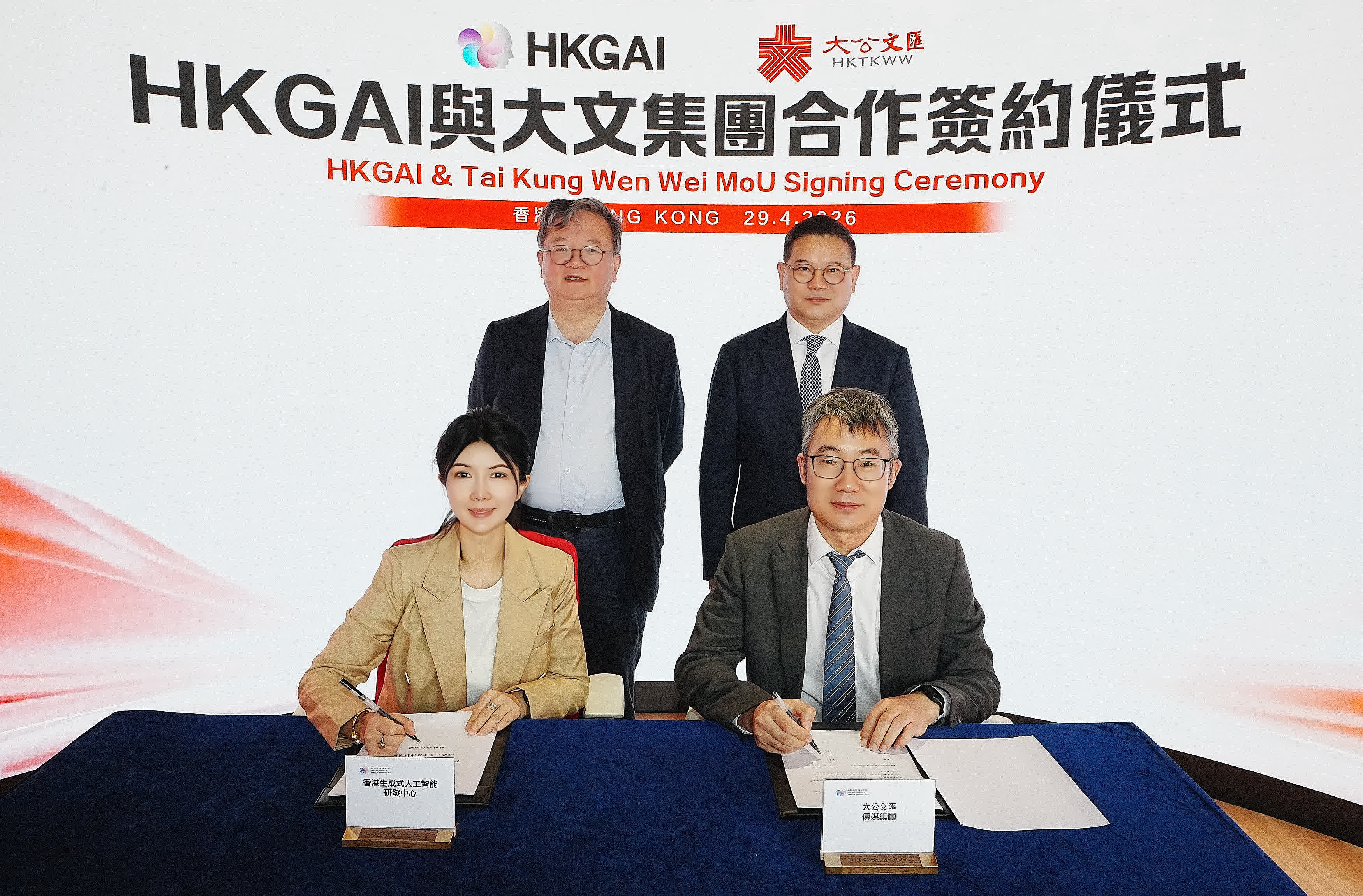 香港科技大學首席副校長、香港生成式人工智能研發中心主任郭毅可,香港大公文匯傳媒集團副董事長、總編輯張國義出席並見證簽約。香港生成式人工智能研發中心首席運營官黃紅英、香港大公文匯傳媒集團全媒體中心負責人閆修彥代表雙方簽約。