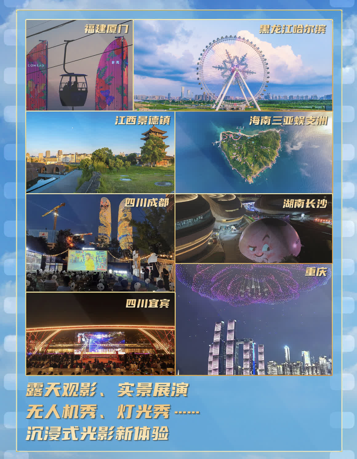 央視新聞還聯動全國多地文旅部門,在黑龍江松花江畔、福建濱海沙灘、江西古街古鎮、重慶山城江岸、浙江寧波等標誌性地點,精心布置露天觀影區、實景展演舞台,搭配無人機秀、燈光秀、帆船秀等沉浸式呈現形式,實現海陸空全方位覆蓋,讓光影元素融入旅途每一處細節。