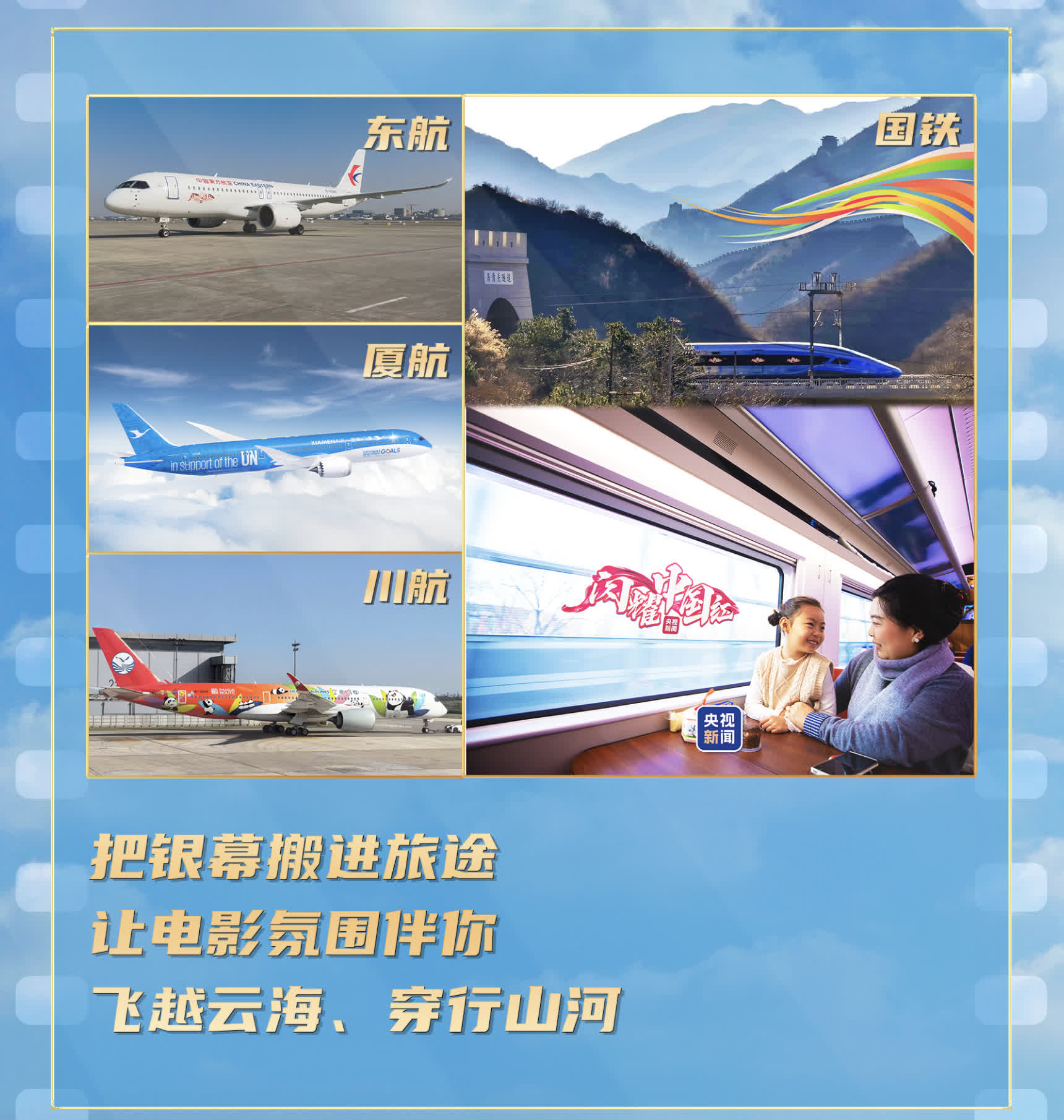 活動期間,央視新聞還聯動多家航空公司和國鐵集團打造主題航班、主題列車,將電影氛圍融入出行全程,讓大家在飛越雲海、穿行山河的過程中隨時邂逅光影驚喜。