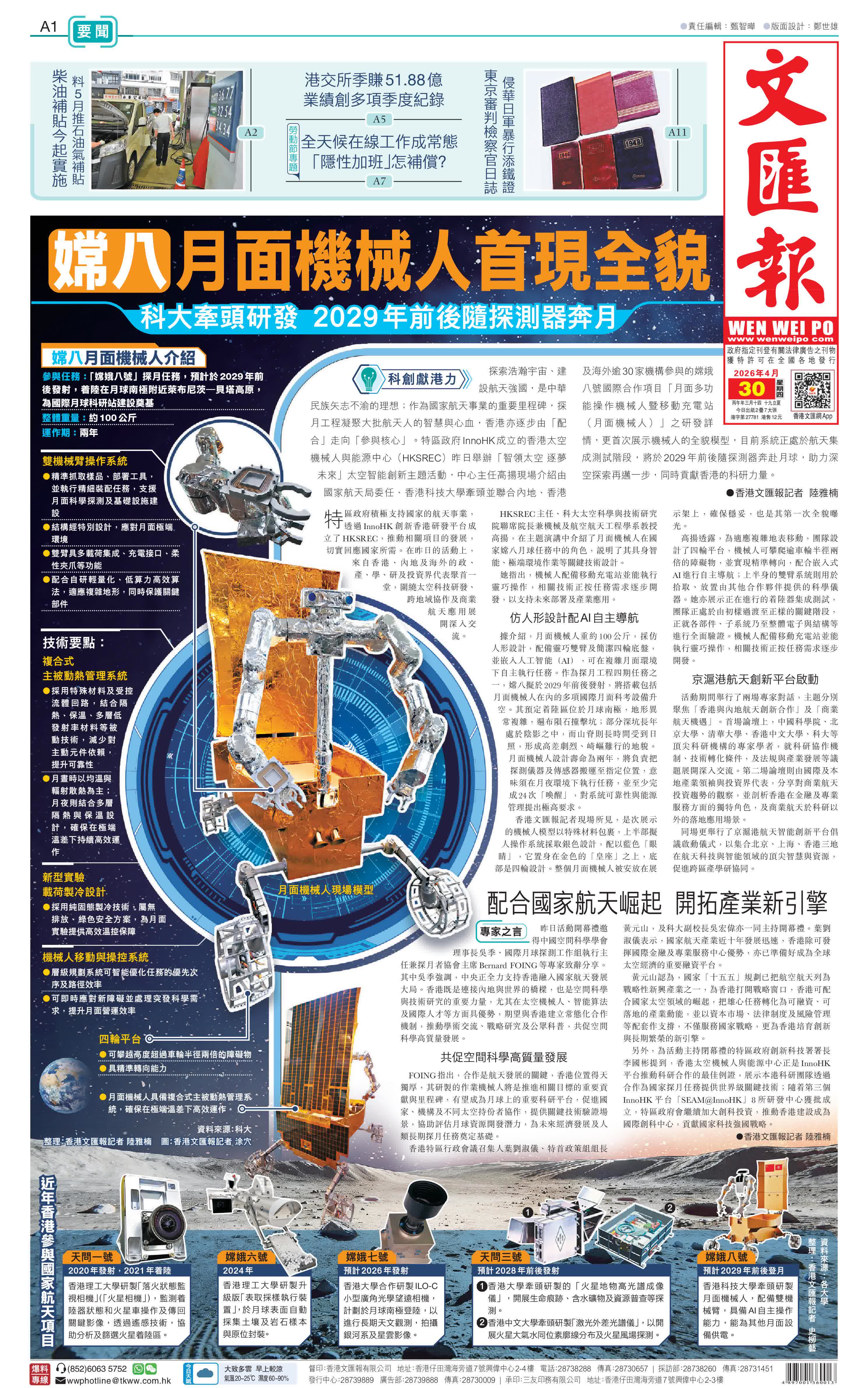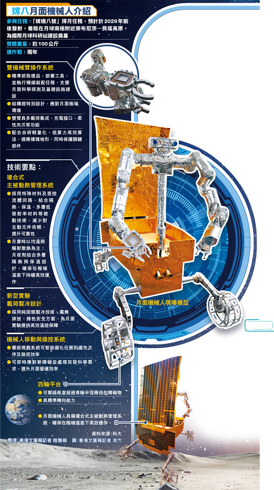 (香港文匯報記者 陸雅楠)探索浩瀚宇宙、建設航天強國,是中華民族矢志不渝的理想;作為國家航天事業的重要里程碑,探月工程凝聚大批航天人的智慧與心血,香港亦逐步由「配合」走向「參與核心」。特區政府InnoHK成立的香港太空機械人與能源中心(HKSREC)昨日舉辦「智領太空 逐夢未來」太空智能創新主題活動,中心主任高揚現場介紹由國家航天局委任、香港科技大學牽頭並聯合內地、香港及海外逾30家機構參與的嫦娥八號國際合作項目「月面多功能操作機械人暨移動充電站(月面機械人)」之研發詳情,更首次展示機械人的全貌模型,目前系統正處於航天集成測試階段,將於2029年前後隨探測器奔赴月球,助力深空探索再邁一步,同時貢獻香港的科研力量。