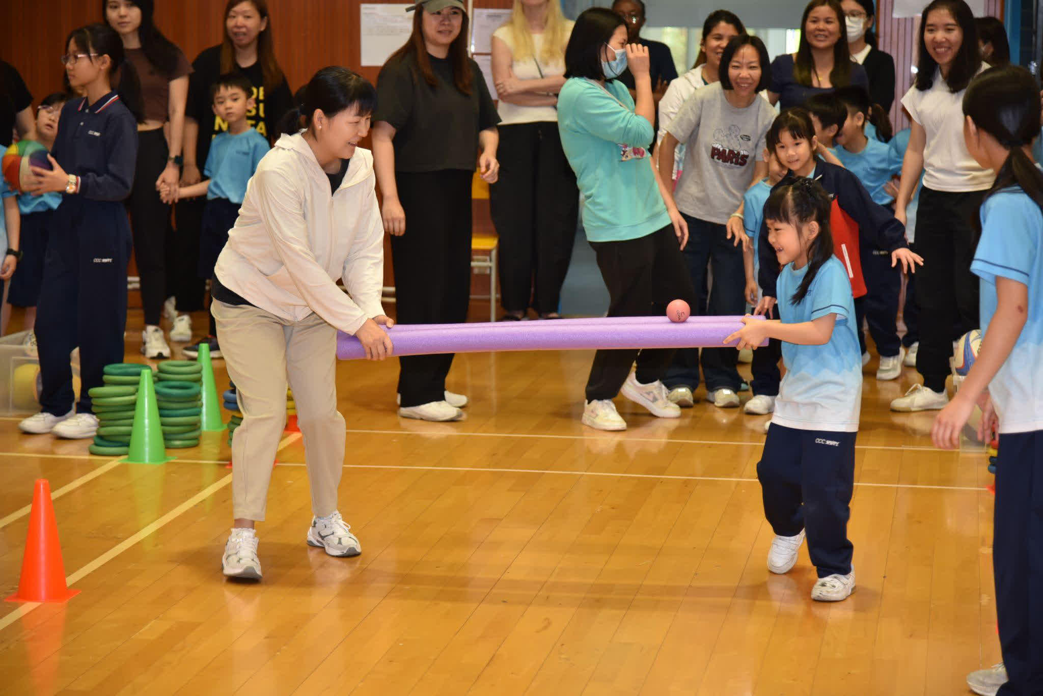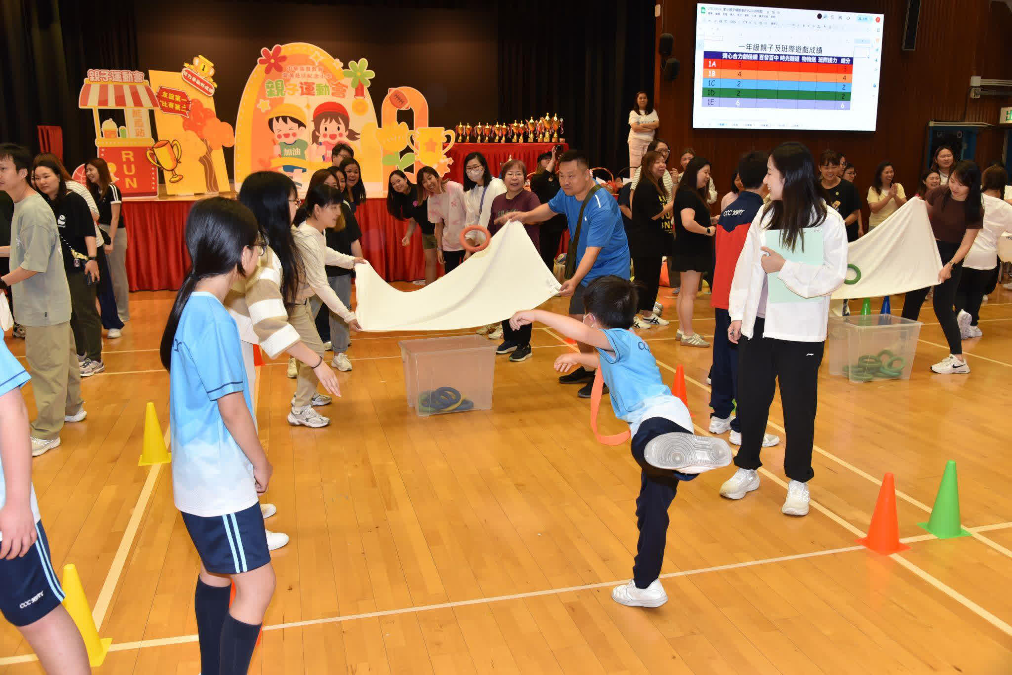 校方表示,在設計項目時,學校特意把「合作」放在核心:讓孩子不只是單靠速度或力量完成任務,而是在一次次協作中學習體育精神與團隊態度。親子競技環節中,「百發百中」需要學生拋出膠圈,而兩位家長以拉直的毛巾合力接住;孩子要學習控制力度與方向,家長也要配合節奏、互相補位。「物物送」同樣考驗默契:家長與孩子合力使用兩條浮條運送不同球類,稍一急躁便容易失手,唯有放慢、協調、一起調整,才能順利完成。「齊心合力創佳績」則把專注與策略融入遊戲,孩子在一拋一擲之間累積成功經驗,也練習面對失誤後再嘗試。