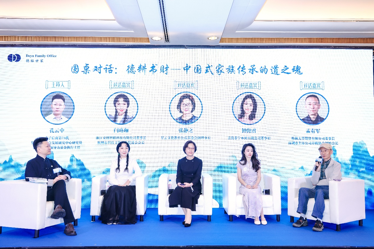第一場圓桌對話,由孔子第78代後裔、復旦大學社會發展研究中心研究員、復旦中國式領導力基金執行主任孔雲中教授主持, 以「德耕書財—中國式家族傳承的道之魂」為主題,匯聚金融、家族接班人、公益慈善、科技投資領域嘉賓,從傳統文化、代際傳承、科技賦能、女性力量等維度,共探道德傳家、善道興家的核心路徑。