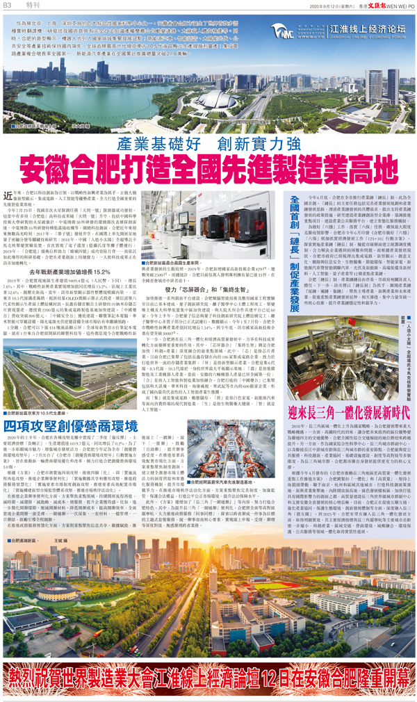 產業基礎好 創新實力強 安徽合肥打造全國先進製造業高地