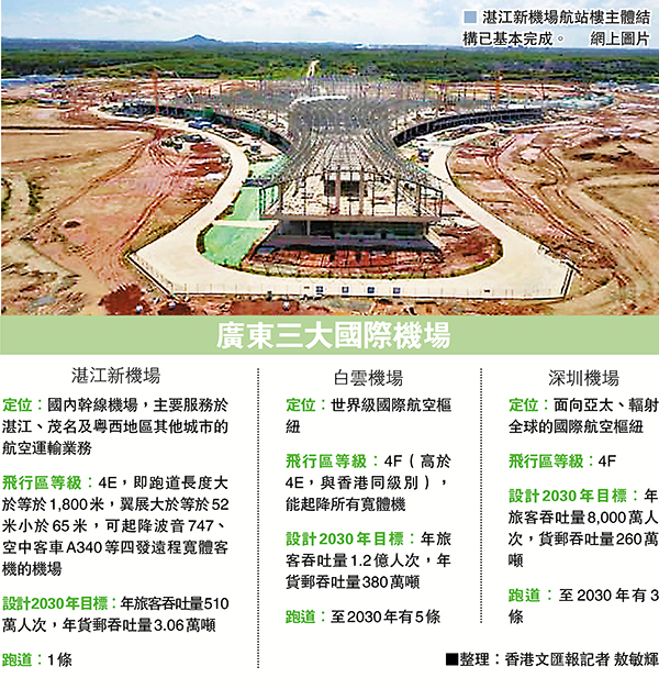 香港文匯報訊(記者 敖敏輝 廣州報道)作為廣東省機場集團在建省重點項目之一的湛江機場遷建工程正在加速推進。香港文匯報記者9月12日獲悉,經近一年的施工建設,湛江新機場航站樓主體工程已經基本完成,並將於2021年底完成全部工程建設,2022年3月投入使用。湛江新機場定位為國內幹線機場,是目前全國唯一在地級市建設的省會標準機場,飛行區等級達到4E,規劃2030年旅客吞吐量達到510萬人次,貨郵吞吐量3.06萬噸。屆時,湛江新機場將主要服務湛江、茂名、陽江、雲浮等在內的粵西地區,並成為廣東跨海連接東盟的重要樞紐。