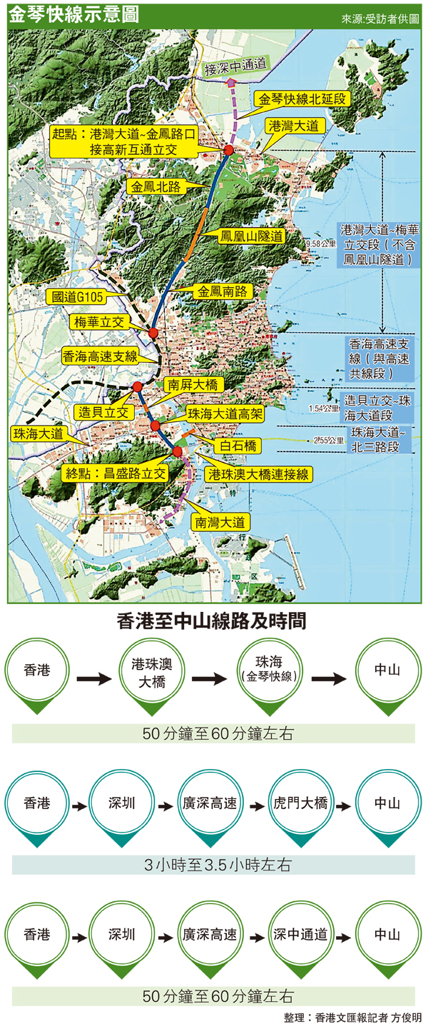 在珠海、中山有投資的港人胡先生表示,自從有了港珠澳大橋,從香港陸路到珠海、中山等珠江西岸城市快了不少;但途經珠海到中山這一路段,遇到高峰期容易塞車。但如果金琴快線建成後,南北向直接貫穿珠海主城區,而且全線不設紅綠燈,預計要比現在路程節省一小時左右,屆時從香港到中山等地最快僅需50分鐘左右。