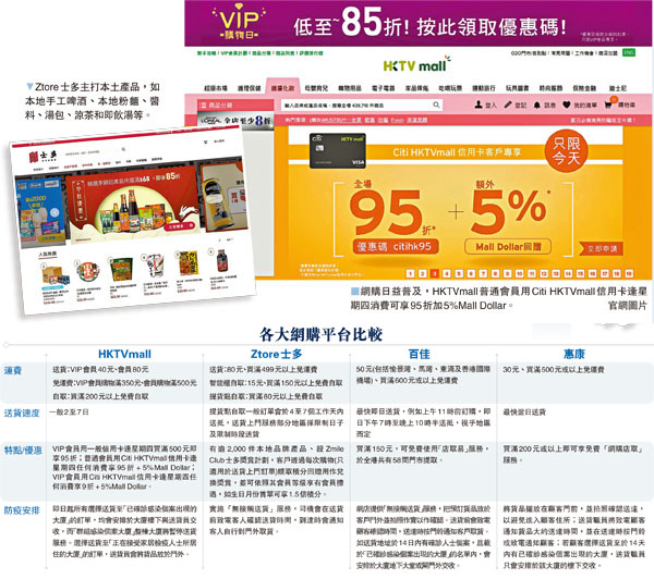 另一個網購平台「Ztore士多」近年同樣備受歡迎,其主要特色是主打本土產品,有超過2,000件本地品牌產品,還提供逾1萬款產品,包括糧油、生活雜貨、美妝護膚品以及抗疫用品等,買滿80元可免費提貨點自取,買滿499元或以上可享免費送貨。Ztore士多主打本土產品,例如有本地手工啤酒、本地粉麵、醬料、湯包、涼茶和即飲湯等。