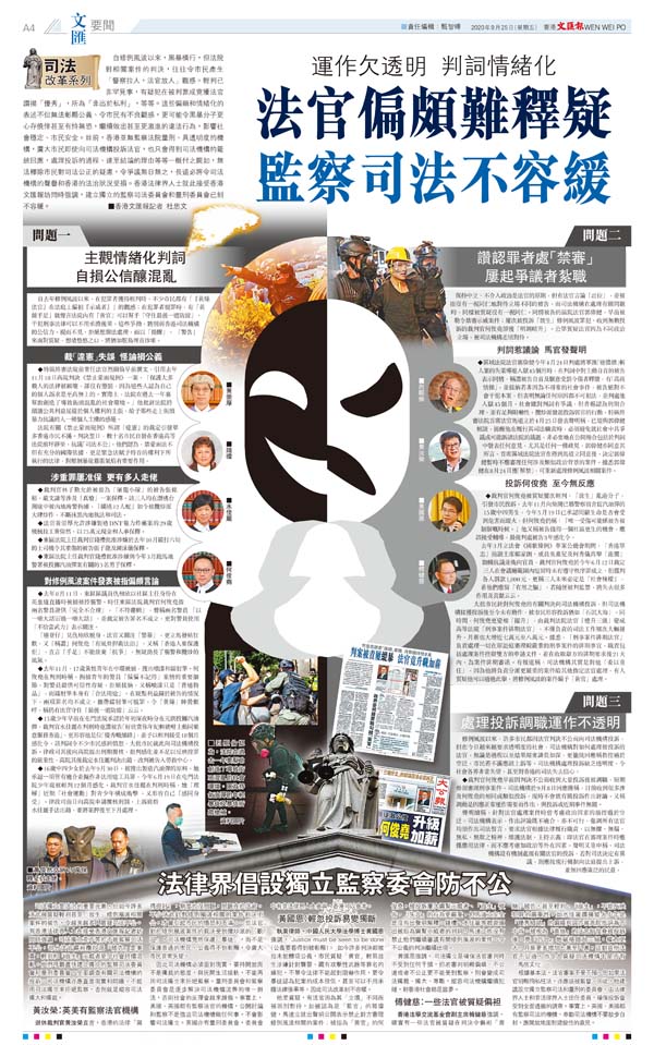 自修例風波以來,黑暴橫行,但法院對相關案件的判決,往往令市民產生「警察拉人,法官放人」觀感。輕判已非罕見事,有疑犯在被判罪成竟獲法官讚揚「優秀」,所為「非出於私利」,等等。這些偏頗和情緒化的表述不但無法彰顯公義、令市民有不良觀感,更可能令黑暴分子更心存僥倖甚至有恃無恐,繼續做出甚至更激進的違法行為,影響社會穩定、市民安全。目前,香港並無監察法院量刑、具透明度的機構,廣大市民即使向司法機構投訴法官,也只會得到司法機構的籠統回應,處理投訴的過程、達至結論的理由等等一概付之闕如,無法釋除市民對司法公正的疑慮,令爭議無日無之,長遠必將令司法機構的聲譽和香港的法治狀況受損。香港法律界人士就此接受香港文匯報訪問時強調,建立獨立的監察司法委員會和量刑委員會已刻不容緩。 ■香港文匯報記者 杜思文
