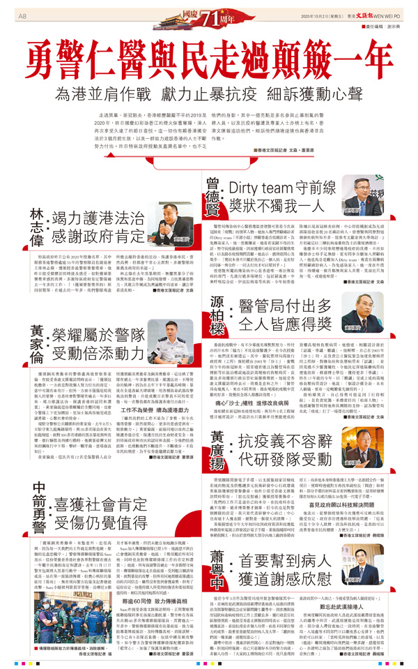 走過黑暴、新冠肺炎,香港經歷顛簸不平的2019及2020年,昨日國慶幻彩詠香江的煙火依舊璀璨,港人再次享受久違了的節日喜悅。這一切也有賴香港國安法於3個月前生效,以及一群致力建設香港的人士不斷努力付出。昨日特區政府授勳及嘉獎名單中,也不乏他們的身影,其中一個亮點是多名參與止暴制亂的警務人員,以及抗疫的醫護及專業人士亦榜上有名,香港文匯報追訪他們,細訴他們順境逆境也與香港並肩作戰。■香港文匯報記者 文森、蕭景源