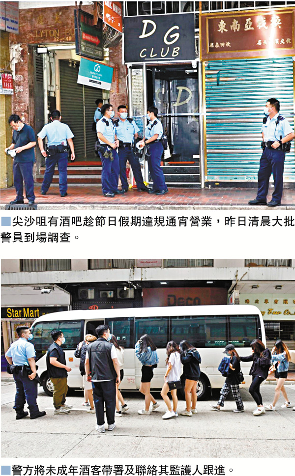 香港文匯報訊(記者 蕭景源)特區政府因應疫情紓緩,上月中放寬酒吧營業時間至午夜12時。有酒吧在國慶兼中秋節長假期間,對顧客「來者不拒」,更「偷雞」違規通宵營業。警方昨晨突擊搜查尖沙咀麼地道36號地下一間酒吧,發現酒吧內竟有143名酒客「犯聚」,當中17人未成年,全部顧客被票控,酒吧男負責人及5名職員涉違反「限業令」被捕。