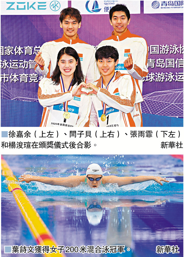 另外,除接力打破世界紀錄外,張雨霏刷新了由中國名將劉子歌在2009年創造的女子100米蝶泳亞洲紀錄,小將王簡嘉禾則打破了自己保持的女子1,500米自由泳亞洲紀錄。 ■中新社