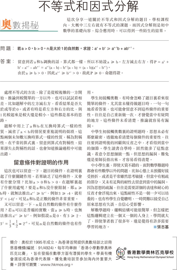 這次也可以留意一下,題目的條件,在證明裏起了什麼關鍵作用。若果缺乏了這些條件,又會有什麼分別?比如a > 0和b > 0,在題解裏起了什麼用處呢?要是a和b沒什麼限制,那a ≥ b時,就無法推出an-1 ≥ bn-1,例如3 ≥ -4,就有32 < (-4)2。可見a和b是正數的條件非常重要。