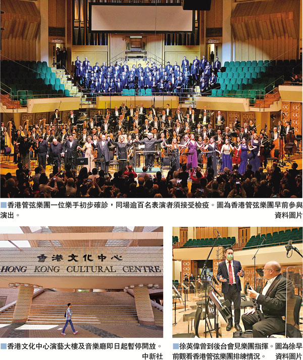 香港管弦樂團亦在其網頁上證實,一名樂師初步確診,正安排到檢疫中心隔離,後台工作人員亦會安排檢測,樂團的辦公室已暫時關閉,並會進行徹底清潔消毒。為安全起見,樂團將取消本月16日及17日、23日及24日的演出,退款安排將於下星期宣布。