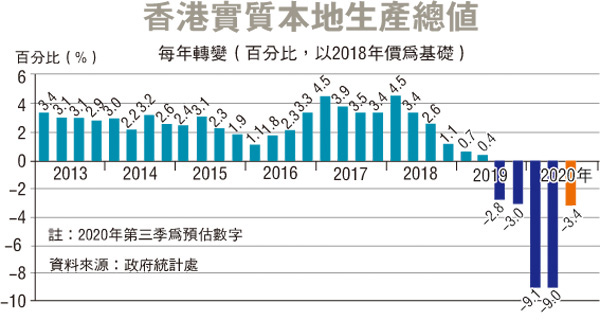 然而,第三季經濟活動仍然明顯低於衰退前的水平。廖群認為,第三季經濟表現雖然超出市場預期,但擺脫經濟衰退的格局仍言之尚早。「第四季已過了一個月,從目前情況來看,對比第三季,10月的表現再進一步改善,但預計香港今年GDP仍要收縮4%至5%。」
