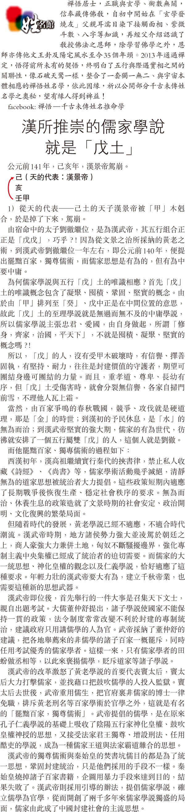 【姓名館】 漢所推崇的儒家學說就是「戊土」