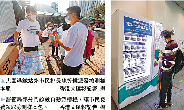 香港文匯報訊(記者 文森)為方便市民接受新冠肺炎病毒檢測,政府昨日起一連3天出動流動樣本車,到曾爆疫的梅窩、大圍,向居民派發及收集樣本瓶。同時,醫管局轄下三間普通科門診診所亦設立自動派發機,讓市民撳機免費索取樣本包,截至昨日中午共派出90個樣本包。有市民希望派發機24小時開放,方便要上班上學的市民。