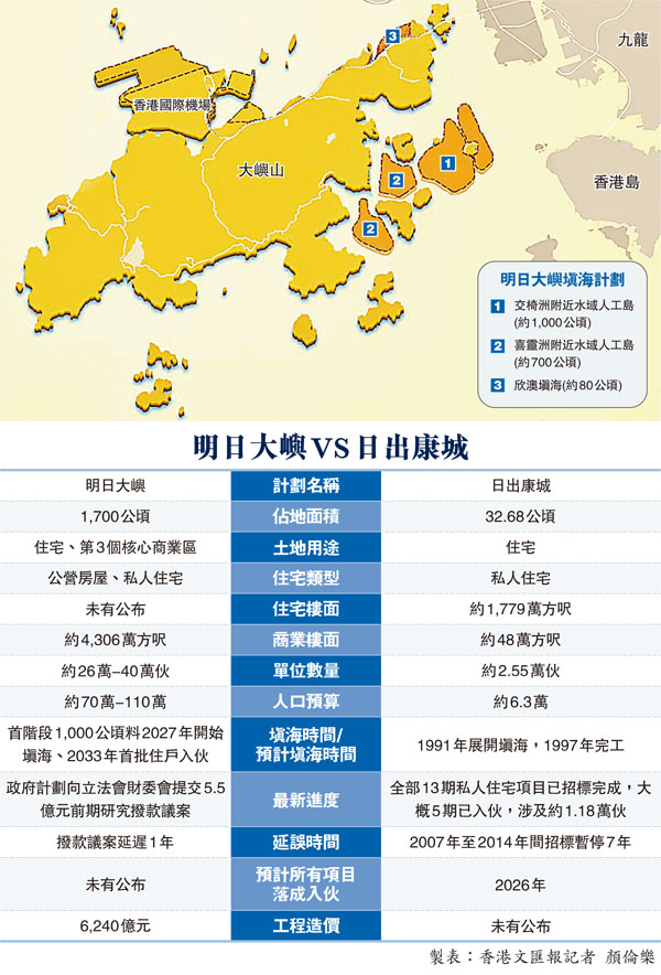 根據政府的規劃,預計工程耗資6,240億元的明日大嶼的總土地面積約1,700公頃,新增住宅單位40萬伙,入住人口最多110萬人,分別較日出康城的32.68公頃、2.55萬伙住宅及6.3萬人,大上51倍、14.68倍及16.46倍。