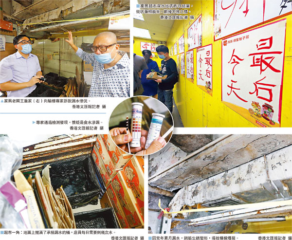 香港的劏房問題嚴重,除了是居住問題外,也危及整幢樓宇的結構安全。家興超市因貨品定價低於市價,故有「良心超市」之稱,其中屹立深水埗逾廿年的分店長年備受樓上劏房亂駁喉管所困擾,以致該店的漏水滲水問題無日無之,店方布置「水桶陣」盛載積水,但滲水已侵蝕橫樑結構,導致鋼筋生銹及變形,石屎爆裂,牆身長滿菇菌,老闆向管理處投訴多年無果,昨日忍痛結業離場。香港文匯報記者早前聯同驗樓專家實地探勘,發現樓宇結構受損,若法團繼續視而不見,超市天花恐於一兩年間有倒塌危機。事實上,家興超市的情況只屬冰山一角,全港其他有劏房的大廈亦可能面對結構安全問題。■香港文匯報記者 廣濟