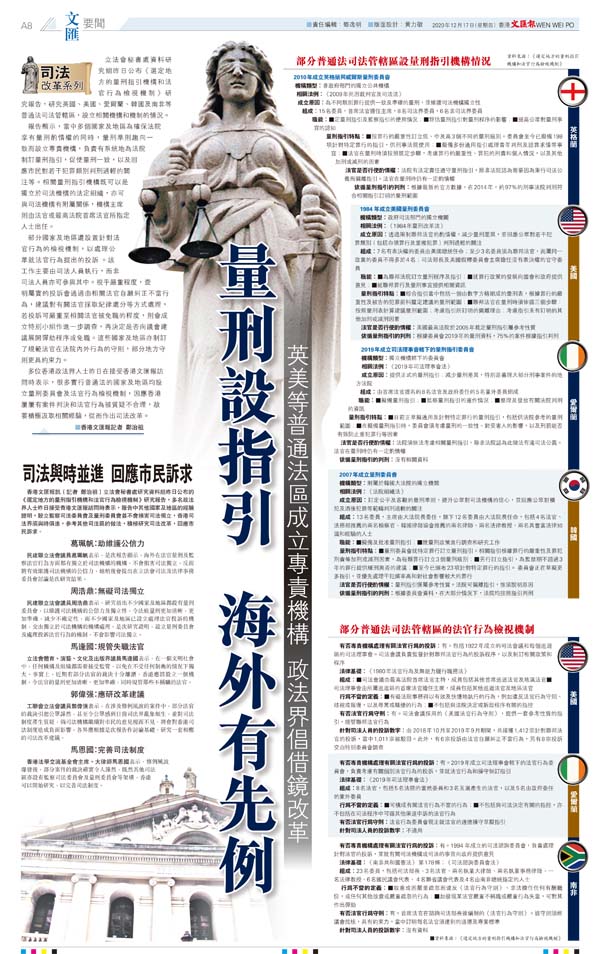 立法會秘書處資料研究組昨日公布《選定地方的量刑指引機構和法官行為檢視機制》研究報告,研究英國、美國、愛爾蘭、韓國及南非等普通法司法管轄區,設立相關機構和機制的情況。