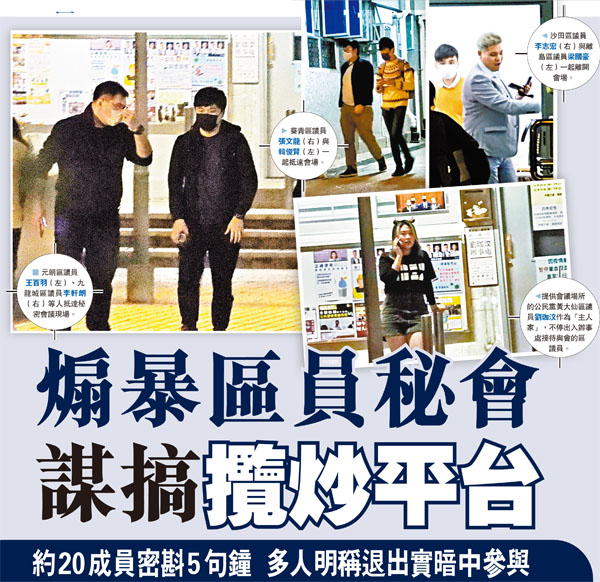 正當全港市民積極抗疫之際,一班攬炒派區議員卻在暗地裏密謀成立一個充滿「港獨」色彩的所謂「香港公民議政平台」,在攬炒派於立法會「鬧辭」之後,企圖轉而組織一個新的「區議會平台」續向政府施壓、向社會攬炒。香港文匯報記者發現,上周末(26日)晚上,約二十名「議政平台」骨幹成員,鬼祟到公民黨黃大仙區議員劉珈汶的辦事處舉行長達5小時的秘密會議。據悉,該「議政平台」預定本月31日將正式宣布成立,而上周六晚的會議是「議政平台」籌備委員會最後一次會議;而對於近期社會熱議的有攬炒派區議員可能會被DQ(取消資格)問題,此次會議也商討了有關應對方式。政界人士昨日在接受香港文匯報訪問時指出,所謂「平台」非法理據充分,應懸崖勒馬,並呼籲執法部門採取行動,嚴禁逾越「紅線」的活動(見另稿)。 ■香港文匯報記者 張得民、齊正之