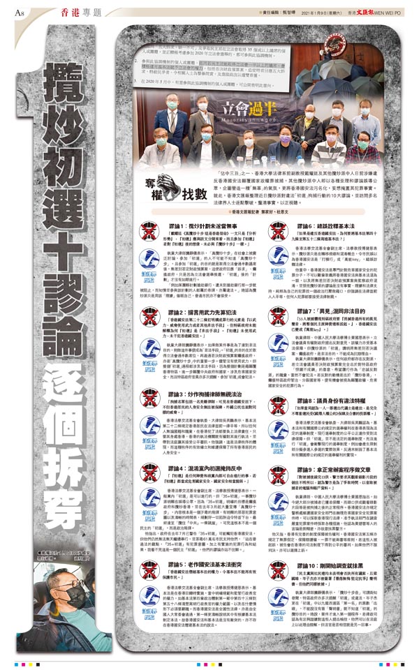 「佔中三丑」之一、香港大學法律系前副教授戴耀廷及其他攬炒派中人日前涉嫌違反香港國安法顛覆國家政權罪被捕,其他攬炒派中人即以各種歪理和謬論誤導公眾,企圖營造一種「無辜」的氣氛,更將香港國安法污名化,妄想掩蓋其犯罪事實。就此,香港文匯報整理近日攬炒派對違法「初選」拘捕行動的10大謬論,並訪問多名法律界人士逐點擊破,釐清事實,以正視聽。●香港文匯報記者 郭家好、杜思文