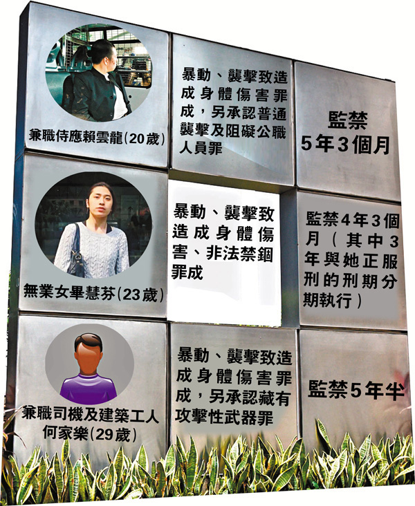 該案涉及4名被告,包括賴雲龍(20歲,兼職侍應)、畢慧芬(23歲、女)、何家樂(29歲,兼職司機及建築工)及黃逸豪(29歲,測量師)。由於證據不足,黃逸豪早前被裁定非法集結及非法禁錮罪罪名不成立,當庭釋放,而賴、畢及何被裁定暴動及襲擊致造成身體傷害罪成。畢另被裁定非法禁錮罪成,賴則另承認普通襲擊及阻礙公職人員罪,何則認藏有攻擊性武器罪。