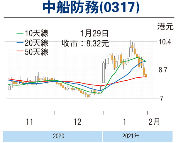 相信上述優勢能為集團帶來可持續發展,並以軍船及裝備建造的專業,作為港股當中較為少見的軍工股之一。中國為求應對而發展的海洋強國戰略,亦憧憬內地海軍船舶需求增加,對中船防務的發展更為有利。集團已積極中山基地建設,以應對有關方面的需求。可考慮於現價買入,上望12港元,跌穿8.10港元止蝕。(筆者沒有持有相關股份,本人客戶持有相關股份)