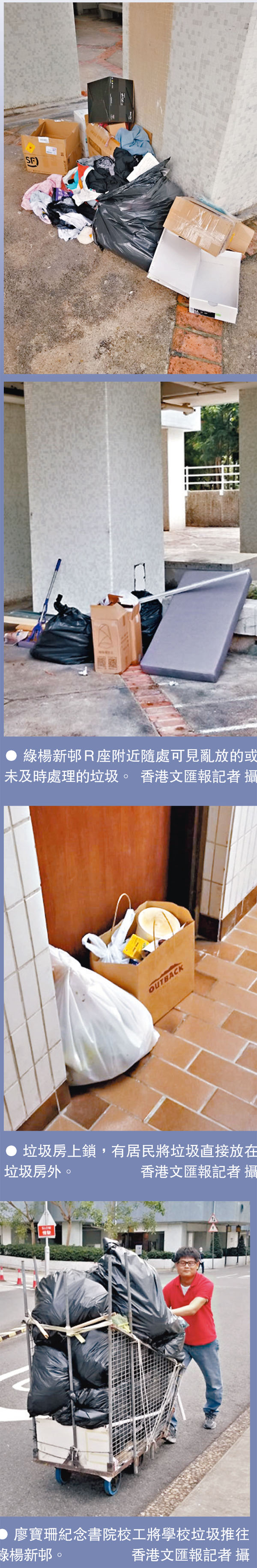 為了解這些問題,香港文匯報記者向綠楊新邨業委會前主席林發耿查詢,他表示廖寶珊紀念書院的垃圾過去一直運到屋苑垃圾站,集中後由食環署清理,但後來垃圾堆積過量,需要屋苑自費處理。林發耿表示:「如果需要業主自費幫學校處理垃圾,當然是不合理的。」