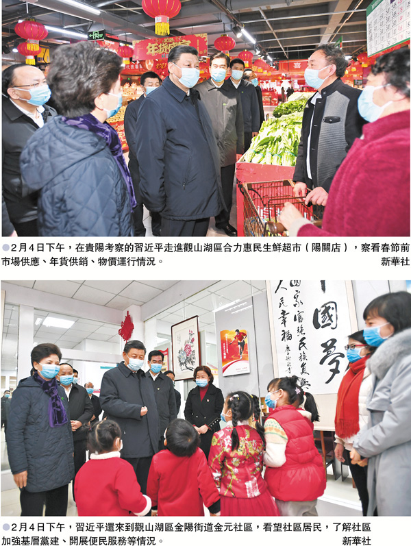 香港文匯報訊 綜合新華社及央視新聞報道,4日下午,正在貴州省貴陽市考察調研的習近平總書記,走進觀山湖區合力惠民生鮮超市(陽關店),察看春節前市場供應、年貨供銷、物價運行情況。隨後,他來到觀山湖區金陽街道金元社區,看望社區居民,了解社區加強基層黨建、開展便民服務等情況。