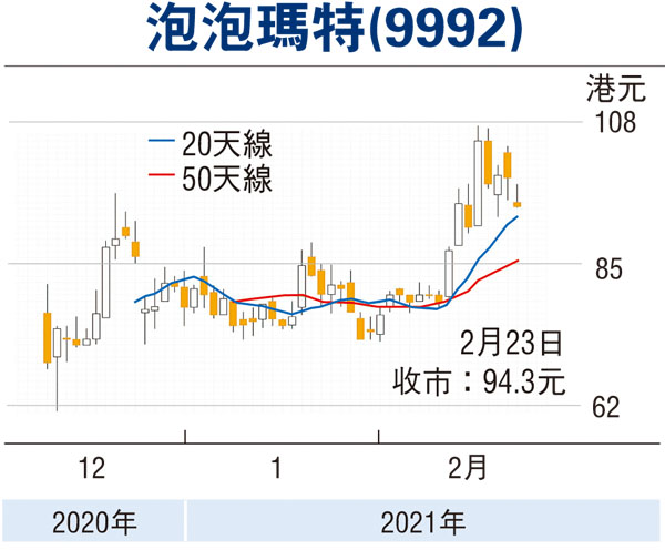 受到疫情影響,加上市民消費力及對生活質素要求日漸提升,相信「新消費」板塊逐漸成型,集團為現時相關概念代表。展望未來,集團的IP開發營運能力、品牌、供應鏈及渠道四大範疇,將驅動行業整合。市場預期集團於2020至2022年三年期間,其銷售及核心盈利複合增長分別為62%,主要是受到其零售網絡擴長及成功產品的發展,以及流行玩具市場的需求不斷增長所帶動。中線建議回試92元以下收集,上試100元目標,跌穿85元止蝕。(筆者為證監會持牌人士,本人及/或有聯繫者沒有於以上發行人或新上市申請人擁有財務權益)