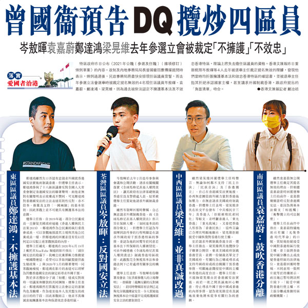 特區政府昨日公布《2021年公職(參選及任職)(雜項修訂)條例草案》的內容。政制及內地事務局局長曾國衞回應傳媒提問時表示,條例通過後,民政事務局將盡快安排現任區議員宣誓,而去年參選立法會選舉時被裁定提名無效的4名現任區議員岑敖暉、袁嘉蔚、鄭達鴻、梁晃維,因為過去被依法認定不擁護基本法及不效忠香港特區,理論上將失去擔任區議員的資格。香港文匯報昨日重新梳理岑敖暉等4人去年被選舉主任裁定提名無效的理據,發現他們當時均拒簽擁護基本法和效忠香港特區的確認書,並被選舉主任指其拒絕承認國家主權,甚至請求外國制裁香港,跟政府提出的「負面清單」吻合。 ●香港文匯報記者 鄭治祖