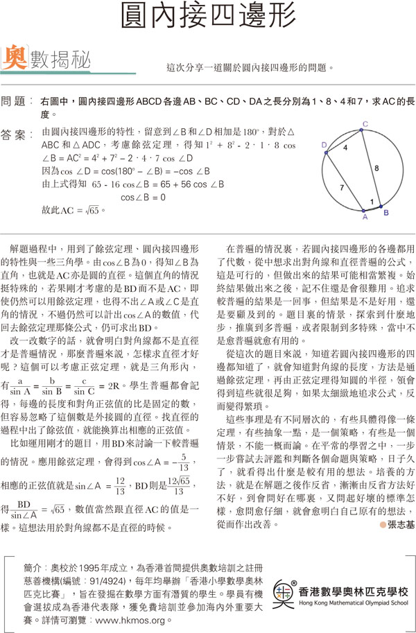 解題過程中,用到了餘弦定理、圓內接四邊形的特性與一些三角學。由cos∠B為0,得知∠B為直角,也就是AC亦是圓的直徑。這個直角的情況挺特殊的,若果剛才考慮的是BD而不是AC,即使仍然可以用餘弦定理,也得不出∠A或∠C是直角的情況,不過仍然可以計出cos∠A的數值,代回去餘弦定理那條公式,仍可求出BD。