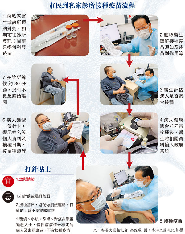 現時全港已有833名私家醫生或診所預訂共6.3萬劑科興疫苗,每名醫生最多獲分發80劑疫苗,並於昨日起為市民接種。年逾60歲的鄔氏夫婦屬於接種優先組別,上周已向私家醫生預約,前日獲診所通知可於昨天接種。