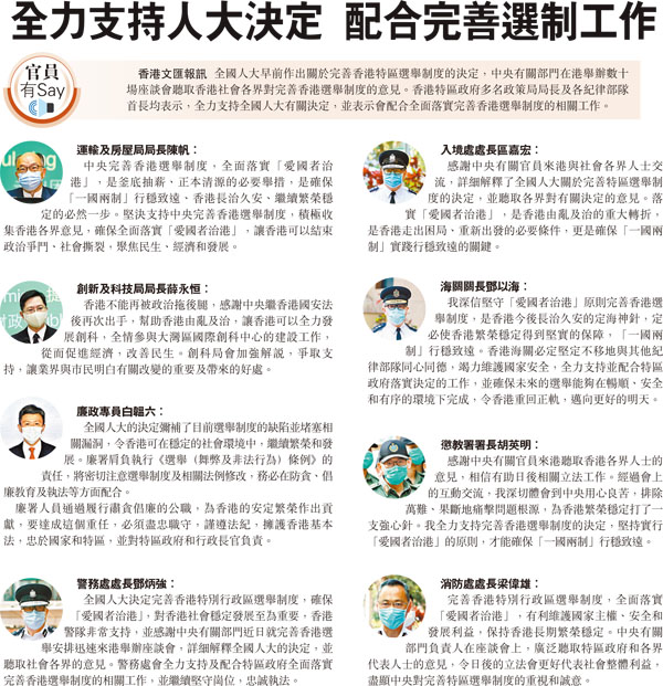 香港文匯報訊 全國人大早前作出關於完善香港特區選舉制度的決定,中央有關部門在港舉辦數十場座談會聽取香港社會各界對完善香港選舉制度的意見。香港特區政府多名政策局局長及各紀律部隊首長均表示,全力支持全國人大有關決定,並表示會配合全面落實完善香港選舉制度的相關工作。