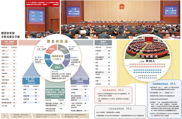 立法會方面,新修訂的附件二列明,香港特區立法會議員每屆90人。通過選舉委員會選舉、功能團體選舉、分區直接選舉三種方式分別產生40人、30人、20人。
