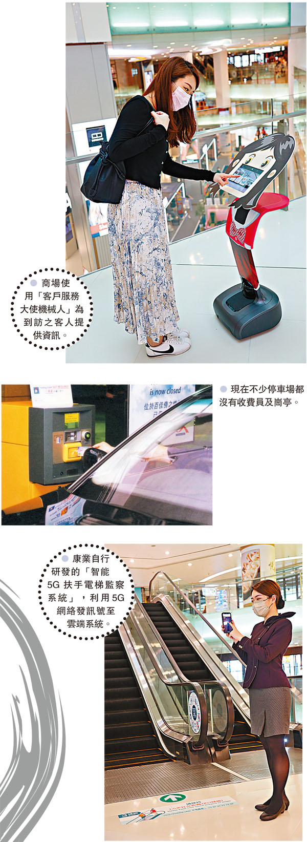 此外,商場引進了「客戶服務大使機械人」,為到訪之客人提供快捷方便的資訊。公司也使用自行研發的「智能5G 扶手電梯監察系統」,當電梯一旦意外停機,系統即利用5G網絡發訊號至雲端系統,把訊息送到員工手機,便可即時跟進處理。