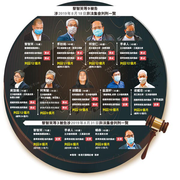 涉嫌干犯國安法被還柙的壹傳媒創辦人黎智英等10名攬炒政棍,昨日就前年8月18日及8月31日組織及參與未經批准集結兩案接受判刑。法官胡雅文在判刑時批評,一眾被告凌駕法律、衝擊法治,有預謀下蓄意違法,引來潛在暴力風險,性質嚴重,判監是唯一選項,最終10人全部判囚6個月至18個月。其中,黎智英及李卓人因兩案三罪,同因部分刑期同期執行而監禁14個月。不過,胡官「放生」包括法律界的李柱銘、吳靄儀、何俊仁在內的5名被告,判以緩刑不用即時做「監躉」。官司纏身的黎智英昨日首度判監後,再被加控勾結外國或境外勢力危害國家安全罪及意圖妨礙司法公正罪,6月15日再訊。