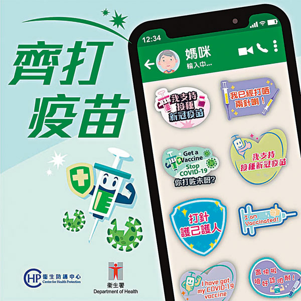 香港已有逾百萬人接種新冠疫苗。衞生署衞生防護中心設計「護己護人,齊打疫苗」的WhatsApp Sticker貼紙,以及facebook個人頭像特效框,並於其社交媒體專頁的帖文上,附上連結供市民下載使用。中心昨日發帖文指出,面對變種病毒株威脅,為保護自己和身邊朋友,接種疫苗實在刻不容緩,請呼籲朋友一齊行動。●文:香港文匯報記者 成祖明 圖:衞生署衞生防護中心fb圖片
